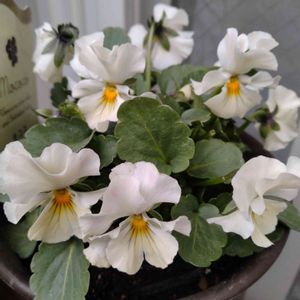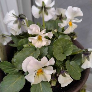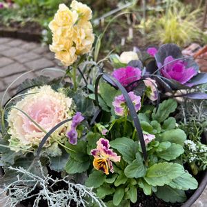 冬の寄せ植え フリル咲きのビオラをメインに。 ロータスブリムストーンと斑入りのバコパがアクセント。 シックなハボタンもお気に入りです。