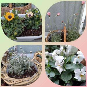 昨日植え込みした子達🤗 ↗️今はひょろひょろで貧相😓春に期待🎵 ↘️ 寄せ植えなら白🤍ってお迎えしたのに結果お一人様😅 ↙️まだお花は咲いてないけど。🧺でナチュラルっぽく🎵 ↖️めちゃ丈夫らしい😁初心者🔰には有難い🙏✨