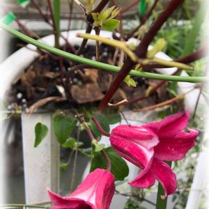 おはようございます😃 今日は雨が降ったり止んだり、たまに晴れ間が出るけどすぐに☔️ 今日のクレマチスプリンセスダイアナです‼️ ずっーと咲いてるから切り戻しの機会が遅れて、先週、いくつか残して切り戻しをしました。 上のグリーンのテープのところはフェンスに巻きついて花が咲いてる一部を残してます‼️ 切り戻したところは新芽が吹き出てきました😉 植物の力はスゴイ〜☺️ 新芽を見て感動です🤩