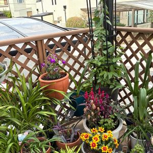 ウッドデッキガーデニング なかなかウッドデッキまでは出来ずに… 部屋にあったチャランを吊るしました💕 それとラナンキュラスは、葉がちょっと黄緑になって来たのでこれも外に❣️
