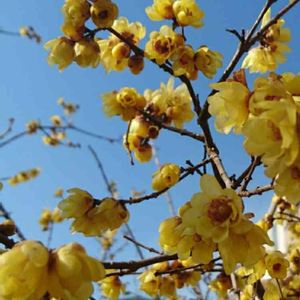 2/10(日)① キュンキュン乙女倶楽部 「2019トキメキ♥️」投稿① 今年見てときめいた蝋梅の花 満月蝋梅と素心蝋梅があることを知りました‼ これは中心が赤いから 満月蝋梅です✨ 青空とコラボレーション♪