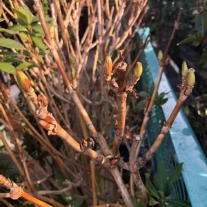 番外部員の参加です。 こんなのでもいい? 我が家の、薄い水色〜紫色の『紫陽花』の芽が出て来ました。 この紫陽花の色に興味のある方は、僕の2018年6月6日の投稿をご覧下さい。 3つある花の上2つの薄紫色がそうです(^^)。