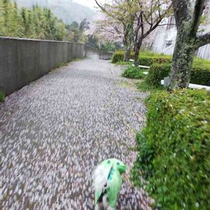 雨の中、桜の絨毯を駆け抜けるガチャピン😄 リンくん寄り道してないで早く💩して帰ろう。