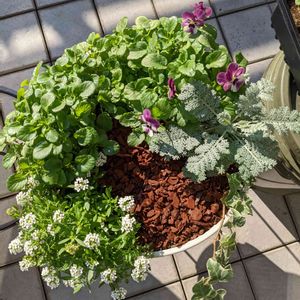 22/10/15 買ってから植え付けてなかったビオラソルベラズベリーやらアリッサムを寄植え。 真ん中の空きはもうちょっとしてからクロッカスを植える予定。 ところがガラス戸寄りに置きすぎて、この2日後に折りたたみ式のベランダのドアを息子が開けたときに倒れて散らばることに。 その後、鉢に戻すも暗くてイマイチ見えず、アイビーが下に垂れずに天を衝くように…