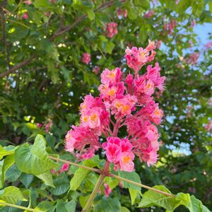 街路樹のベニバナトチノキの 立派な赤花が目を惹くようになりました😍✨❤️🎶 北米南部原産のアカバナトチノキとヨーロッパ原産のセイヨウトチノキ(マロニエ)の交雑種である。 ムクロジ科 トチノキ属の落葉高木。 日本では街路樹などで見られる。 「木曜日は木」 ベニバナトチノキ