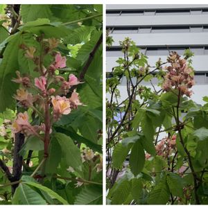 おはようございます😃 雨の朝になりました。 散歩は中止です。 昨日の刈谷駅前ロータリーです。 ベニバナトチノキが咲き出しました。 大きな天狗の団扇のような掌状複葉の葉っぱです。 その上にピンクの小花をたくさん付けた円錐花序が立っています。 日本のトチノキは白い花です。 よく似たマロニエと呼ばれるセイヨウトチノキとアメリカ原産の濃い紅色のアカバナトチノキの交配種のようです。🤔 山で大きな葉っぱと言えば、ホオノキとトチノキです。 ホオノキの葉は短い柄の大きな葉っぱがテーブル状に広がりますが、一つ一つが独立した葉です。 しかし、トチノキの葉っぱは長い柄の先に5枚以上の小葉を持つ複葉です。小葉には柄が見えません。 そして、葉の大きさも前のものが大きくて、付け根のものは小さいです。🤔