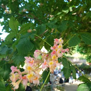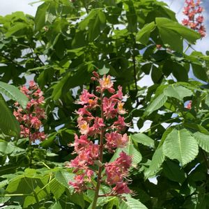 今日の昼休み散歩③ お庭のシンボルツリーのようなかなりの大木。 トチノキか、西洋トチノキ(マロニエ)と思うけど、周囲のベンチでランチ中の人が多くて近付けず。 追記:ついにガーデン内で葉に隠れた名札発見。ベニバナトチノキでした。この写真では花があまり赤く写ってないけど、実物はもう少し赤いです。撮り直したらまた見てくださいね。