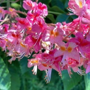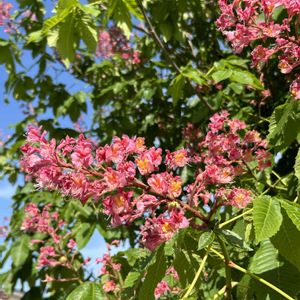 去年は撮り損なっていた、気になる お花 (^o^)♡ 💗 ベニバナトチノキ 💗 (紅花栃の木) 北アメリカ原産のアカバナトチノキとヨーロッパ原産のセイヨウトチノキの交配種 ムクロジ科・トチノキ属 青々とした🌳に鮮やかな花が元気に 咲いてました🤩