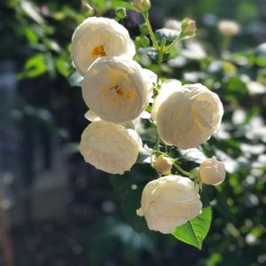 Artemis アルテミス 作出 2004年 ドイツ Hans Jürgen Evers 系統 F フロリバンダ 交配 未発表 花色 白 花形 カップ咲き~平咲き 花径 中輪 芳香 中香 香質 ティー 開花 繰り返し咲き 樹高 1.5m ひと枝にたっぷり房咲きになるアルテミス🌹 病気にも強いし日陰もわりと平気で育てやすいバラです。 が……長めの花枝を伸ばして先で咲くので、低いフェンスとかが合いそう。私は前にトレリスに誘引していたんですが、枝が硬いので思うようにならず、今は木立タイプになるように剪定しています💦