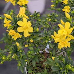 オウバイモドキ(黄梅擬) 赤い冬芽(花芽)がかわいい😃 💛💛💛💛 モクセイ科ソケイ属 別名:ウンナンオウバイ(雲南黄梅) 枝はつる性、断面は四角、垂れています 花びらは6~10枚に分裂するため、二重、八重咲きに見えます 香りはありません 💛💛💛💛 🌱🌱🌱🌱😅 💛オウバイモドキは、オウバイをまねしてる⁉️ 💛オウバイは、 半つる性の落葉低木、 花径は1.5㎝ 💛オウバイモドキは、 つる性の常緑低木、 花径は3㎝ 💛オウバイは葉より先に花が咲きます😃 💛花が咲いている時に、葉があるのはオウバイモドキ🤗 💛葉が無いのが、オウバイ🤗 💛オウバイモドキの花はオウバイよりも大きい😃 🌱🌱🌱🌱🌱 オウバイモドキは、オウバイをまねしてるつもりはないのに、ちよっと気の毒な名前ですね😅