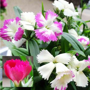 ♪ナデシコ 白色の苗から縁がピンク色が 咲きました♡ 赤色のもうすぐ 開きそうなのもカワイイです♡