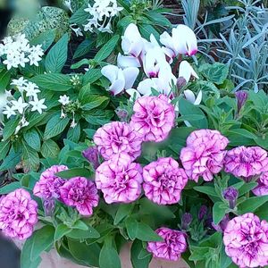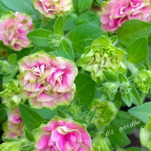 八重咲きペチュニアの花結び୨୧ が綺麗に咲いています😚💞 夏前に処分で💗と💜を連れて来ましたが💜さんは★になっちゃいました🤣 この子には冬越し頑張って貰います😊⛄️❄️💪🎵