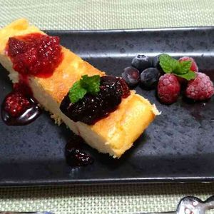 うちで取れたブルーベリーとラズベリー、ワイルドストロベリーをソースにして チーズケーキを焼いた😋 子供たちも大喜びでソースたっぷりかけて幸せそうに食べてくれた😍✨