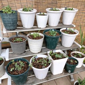 【1枚目】【2枚目】放置していたラナンキュラスの芽出し苗を植え付け、軒下の縁側にズラリと並べました💪😤💪 鉢に統一感はありませんが、あまり鉢を増やしたくないので手持ちの鉢で収まり良かったです😌 植え付けが遅れたので花数は少なくなりそうですが、何とか開花して欲しいです🙏 【3枚目】こちらは今季購入した球根からでエレガンス・チョコレートです(タグには間違えてブラックって書いちゃった😋)。葉の色が濃いめなところから、花色が濃いだろうことがうかがえます。葉も少し班入りっぽい? ただの病気とかだったら嫌だわー😅💦 商品名はチョコレートと言いつつ品種名はバイオレットらしいんですが、いったいどんな色なんだろうか? 濃い紫だけど光の具合でチョコレート色にも見えるらしいです。そんなの楽しみ過ぎるー!😍💕 【4枚目】今回の植え方。 ①もし根詰まりしてもポコっと植え替えられるように底石は入れず、赤玉土中粒を底に敷く。 ②ラナンキュラスの根は折れやすいので、崩さずそのままそーっと植える。 ③リンカリ肥料は土に混ぜてあるので、窒素肥料として醗酵油かすを鉢の縁に埋め込む。 ④油かすに土をかけて埋め、植え付け完了。上からオルトラン粒剤をパラパラ撒き、水をやり終了👌 昨季は12月中旬と1月中旬に植え付けていたので、今季は1ヶ月も遅れちゃった💦 でもラナンキュラスの開花は4月なのでギリギリ間に合ったかな😌 なんとか咲いてくれるといいな🥹🙏