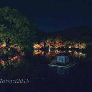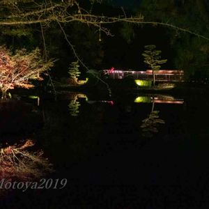 2019.11.30 東京都 町田薬師池公園 紅葉祭りのライトアップ 橋の上から手持ちで撮影 天気がよくて風も弱く水鏡もお月さまも綺麗でした。