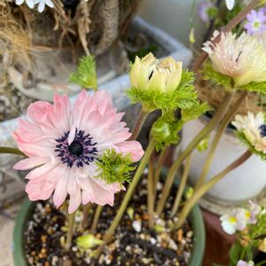 連投です😆 アネモネアンアリスが3株入ったお高めの鉢が4桁から3桁ワンコイン🤑になってるのを見つけました❣️ アネモネアンアリスの薄い色は今年は中々出会えずお高い事だし諦めてました😂 いつものショップの見切りコーナーで見つけたこの子は可哀想な位沢山の細い下葉が腐っていてコバエもいるしナメクジも沢山潜んでいましたが探していた薄いピンクと黄緑の花弁と破格⁉️のお値段なので思い切ってお迎えしました😆✊ 下葉は全部取って土もみっちりだったので根っこを1/3カット肩の部分の土も削ぎ取ってとりあえず一回り大きめのポットに植え替えて消毒としてオーソサイドを振り撒いておきました。 元気が戻ってくるといいなぁ😊🍀