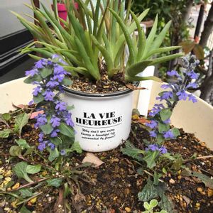 こんにちは😊 まるちゃんからの アジュガ💜さん咲きました💕 みらいちゃんからの アロエ💚さんもりもりです💕 繋がりに感謝です🤗ありがとう*\(^o^)/*