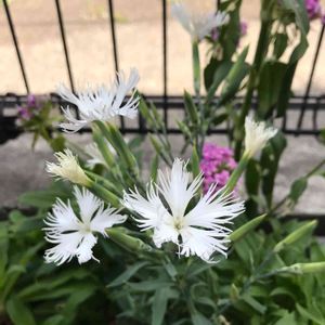 こんにちは😊 良い天気☀️で暑いですね💦 白色の可愛いお花🌼咲いてるけど 植えた覚えがなくて😅 カーネーションかな? これって何の花? 教えて下さい🙏