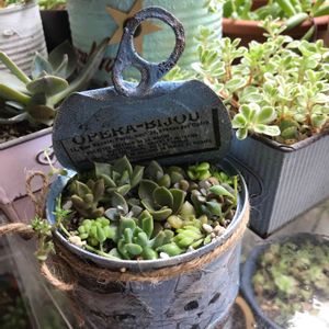 こんにちは〜☁️ 寒い日になりました💦 クリスタルサンのプレ企画で当選した 可愛いリメ缶にチマチマ寄せ植え🌵💕