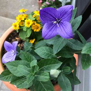 こんばんは⭐️ 去年買って冬越しした キキョウ💜が今年も咲いてくれました キキョウだけだと鉢が いっぱいにならなかったので 黄色のお花 メランポジウム💛100円でゲット👍