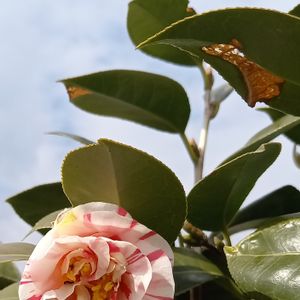 先日の名前を知らなかった椿 四海波と言うらしい ちょっとボンヤリした空に 可愛く咲いてます 虫食い葉っぱも悪くないかも