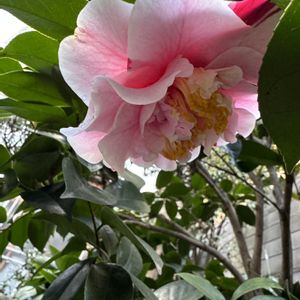 ツバキ(四海波)・・・ 咲いていますが、花が大きく重さで垂れて、スマホ📱でパチリ🤳がなかなかに大変です😂