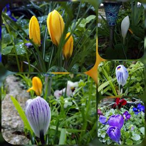 庭に去年も咲いた紫色のクロッカスを探していたら ビタミンカラーのクロッカスが… .あっちこっちに⭐️
