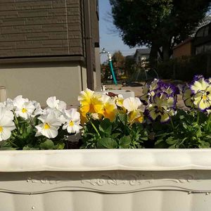 寄せ植えしたばかりのホヤホヤさん フリフリビオラが主役 早くモリモリになぁーれ😊