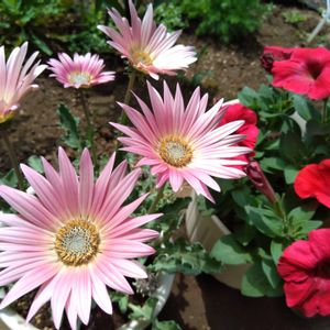 咲き始めましたよ ローダンセマム🎵 3種寄せ植え みんな別々の方向向いてる😓 喧嘩しましたか?
