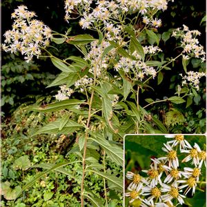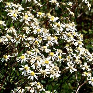 ゴマナ(胡麻奈) *キク科シオン属 花期は8〜10月 本州〜九州の日当たりの良い草原や道端などに生育するが、亜高山帯で良く見られる! 1〜1.5mほどまでに大きくなり、茎は直立して上部で枝分かれして白い舌状花がたくさん咲きます。(シロヨメナやノコンギクより一回り小さな花が密に咲く) 10月3日投稿したゴマナが、どうしても納得がいかず再投稿しました❗️ 確認する為に、毎年見ていたゴマナの咲く場所に撮りに行ってきました。 10月9日撮影