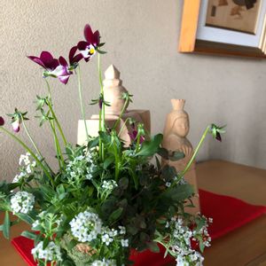 先日 イベントで ✨プランツギャザリング✨ 受講して来ました 3種の花を合わせて小さい花束風 に植え込む技法✌️ 苔玉の様にして 愛でてます