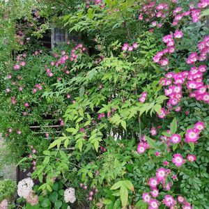 ~❀❀1枚目~3枚目 雨の中 安曇野が咲き出しました♡ 今年はこの安曇野を自由放任にして どれくらい❓何メートル位 枝を伸ばせるかチャレンジしてもらっています。 長さ5メートルはありそう!!? 昨日は更にワイヤーロープに誘引でした。 来季はミニパーゴラ風の屋根を付けて上げたらいいかな❓ 小さい花ながらも領地拡大にほほ笑む 安曇野姫さまです。。 おととしまでピエール ド ロンサールが裏側にいましたが、洪水で亡くなりまして、新しい仲間募集中です~ 安曇野は花期やや遅めのバラです。 4枚目 アイスバーグ 雨でしっとり 5枚目 名前のわからないクレマチス ご存じの方 誰か教えて下さ〜い。 (ドクターラッペルが一番近い気がしてます🤔)