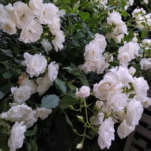🌹つるアイスバーグのアーチ アーチに仕立ててから3回目 地植えにして5年目です 手前のソヨゴかちょっと 邪魔になってしまいました😅 アイスバーグ 花持ちが良いです 雨も降りました 今日は風が強いですが 良く咲いてくれてます🌹✨