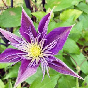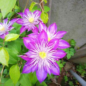 3番目の開花は、シベがぎっしりのクリスタルファウンテン💜なぜだか地面の近くでくっついて咲いています😂 クリスタル ファウンテンは クレマチスの育種で有名なレイモンド・エヴィソン氏のリーガルシリーズのクレマチス。 だけど日本の早川 廣氏が発見した品種だそうで 日本名はフェアリーブルー。ちょっと複雑な事情がありそうです🤯 咲き始めは緑っぽいですが、だんだん青紫になっていくはず💜