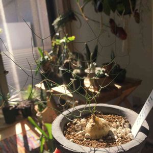 2017年7月に播種のシゾバシス。 10粒中9本発芽。 秋頃からだんだんと減り、現在3本に。 ツルツルテカテカのまん丸に育ってほしい。(´・ω・`)