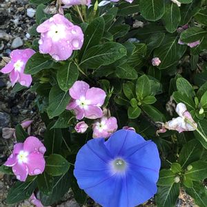 こんにちは😃 iPhone8(ふる)で夕方撮ると、かえって明るくなった😅 ペチュニア❣️さん、花の色が濃いと寒さに強い⁉️ 氷点下を経験しても元気だ 😊