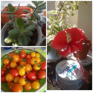 チョキン😃✂️✨していただいてきた金の成木 落ち着いて元気に育ってくれている🎶😆嬉しい ミニトマトはもう最後の収穫になるかなぁ🎶 ハイビスカス😃 毎日咲いてくれてます❗️😃💕まだ、蕾があるので楽しみ🎶💕🎶🥰