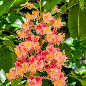 セイヨウトチノキ(西洋栃の木)の花が咲いていました。 トチノキ科の落葉高木で、マロニエとも✨ 赤い模様の入った白い4弁花が、ピラミッド状に集まって上向きに咲きます💕 🔶3枚目~5枚目:ベニバナトチノキ💕 こちらも高い木の上に花が咲いていました🎶😃