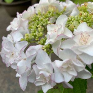 アジサイ KEIKO ♡ 先週の猛暑で花が焼けて しまいました。この子はかろうじて 救われました😊 他のアジサイもかなり焼けてしまい もう剪定するしかないですね😭💦