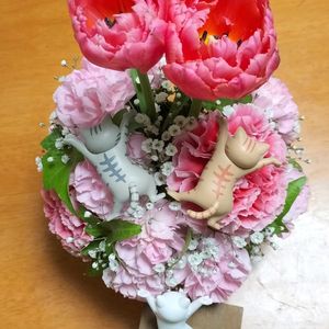 オケツの日🍑 え〜2月も終わり〜? ってお約束の言葉🤣 この1ヶ月も早かった…🌿 お花のアレンジメントいただきました〜💐 こんもりしたカーネーションからチューリップがニョキ😆 アイビーが間に入ってアクセントになっています✨ 斬新なデザイン😆 ダンシング猫さんもついお花の上にダイブ🐱🐱🐱 白猫ちゃん出遅れてるよ〜😁 2月もありがとうございました🍀 3月はワクワクイベントあるから楽しみ〜💕
