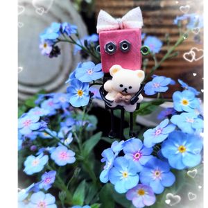 今日はシロクマの日🐻❄️ 可愛いピックを見つけました リボンを付けたロボ子ちゃん🎀 シロクマちゃんを抱っこしています☺️ 大輪忘れな草 ミオソティス ミオマルク 可愛いブルーのお花がいっぱい 中心が星形に見えて色合いも変化しているのがキュンです💕