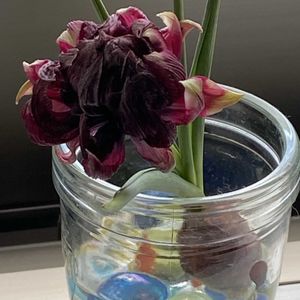 久しぶりにお花屋さんへ 小さなチューリップ🌷を見つけ 愛でることに 幾重にも花びらが💗 チューリップの水耕栽培は 初めて