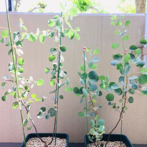 いい天気です☀️ベランダパトロール。 ユーカリさん 2つ共ユーカリポポラス名で 300円で去年9月頃狩ってきました(*'▽'*) 左は40cmから70cmに成長 右は30cmから40cmに成長 右はなんだかポポラスではないだろう と思います。全体的に小ぶりな葉が ついてます。 春になったら植え替えかな?