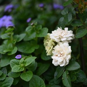 本日2枚目失礼します♪💛😊 ミニバラのグリーンアイス三輪がぎゅっと集まって咲いています♪ アゲラタムに寄り添うように咲いていて、見ているだけで気持ちが和みます。