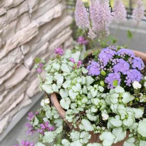 どんどん増えていくラミウム 花が咲いたのでアゲラタムを一緒に植えてみました✨
