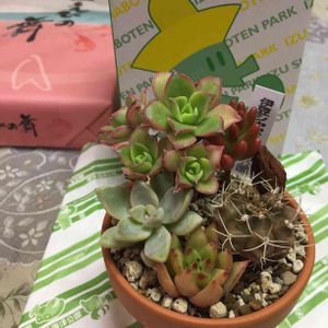 娘からの伊豆旅行土産💕 欲しかった牡丹玉が無くて、似た花が咲く『翠晃冠』と『虹の玉』『夕映え』『魅惑の宵』『桜牡丹』を寄せてくれました😊