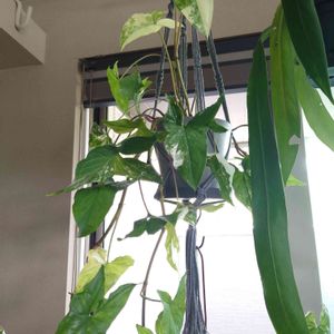 Syngonium albo variegata / Hoya krohniana silver / Hoya polyneura フィッシュテールの鉢にサイズぴったりのハンギングバスケットを見つけました🙌🪴 あと、クローニアナシルバーの下の1本からはもう芽が出てこないと思ってたけど、いつの間にか小さな葉っぱが4枚いました😃めっちゃ嬉しい✨🤍