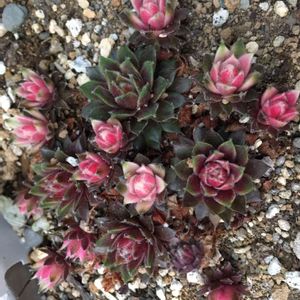 新しいお友達を(以下略) センペルビウム属 バニラシフォンちゃんです💗.+:。(´ω`*)゜.+:。💕 春先の子株や新芽にこんな桃色ペールな色になるんですって。 普通の緑色に変わる前なのね〜😍 冬には紅葉もするらしい🎶 多肉ちゃんたちも少しずつ増えてます。多彩で面白いね。