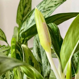 うちのも咲きました✨淡いグリーン ✨ 素敵ユーザーお二人のアグラオネマさんと、合わせたかのように開いてくれました💓💓 シルバークイーンと間違えて連れてきた、品種不明のステムが真っ白の子🌿奥が本物のシルバークイーン🌿