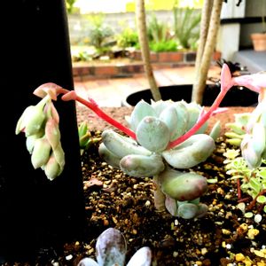 暴風の影響。。。 月美人の花芽が ザリガニ みたくなってた。。。 群生さそうと いろいろ葉押ししてたのが、風で混ざってる。。。 問題は…セダムの頭をちょん切ったのが… 無い‼️ あちこち飛んでたら後が大変(´・Д・)」